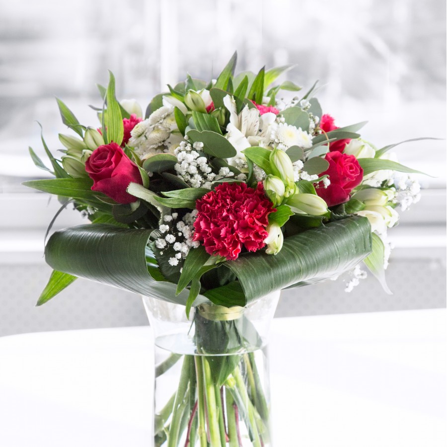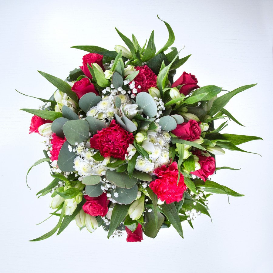 Let the enchanting beauty of our Enchanting Beauty Bouquet inspire you. This captivating arrangement combines rich red roses with delightful carnations, elegantly mixed with pristine white chrysanthemums and delicate gypsophila. Finished with white alstroemeria and vibrant aspidistra leaves, each flower is hand-selected to ensure top-tier freshness and quality.