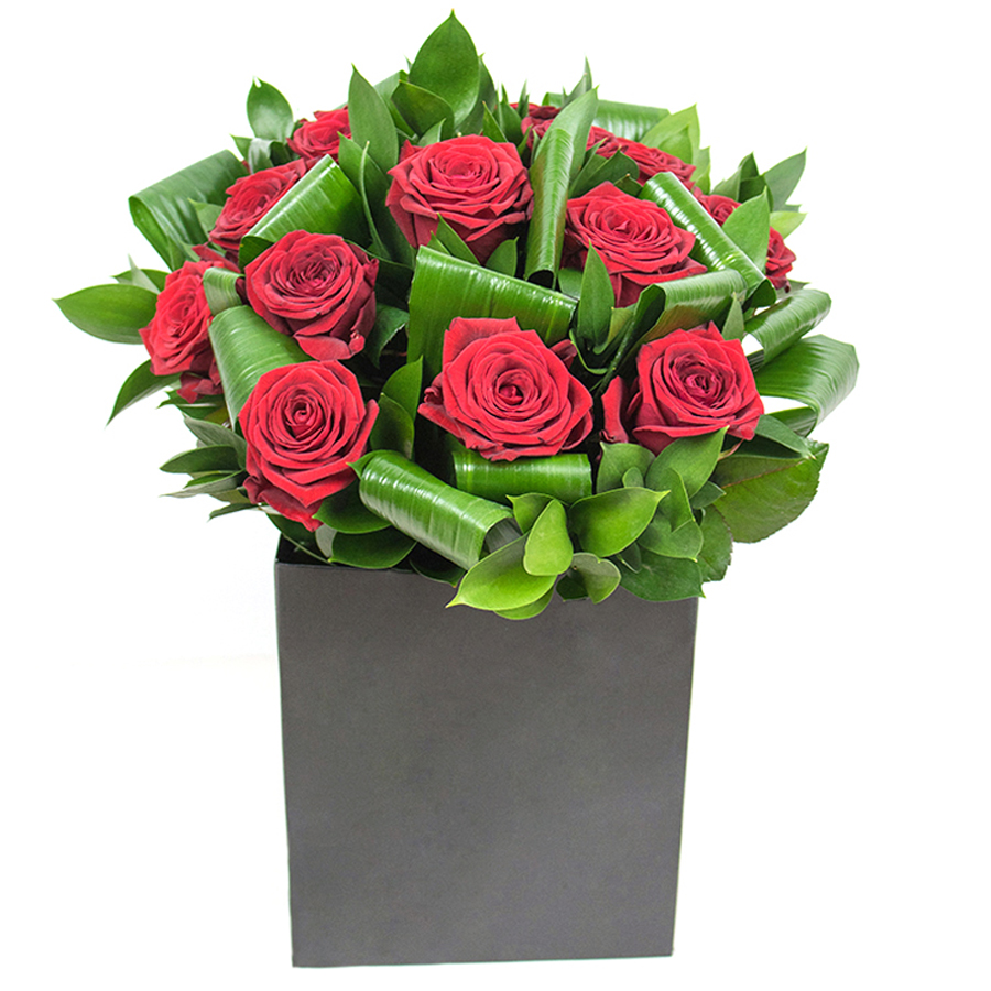 Introduce sophistication to any room with our bouquet of vibrant red roses, lush aspidistra leaves, and elegant ruscus. This unique arrangement combines color and style for a truly luxurious display.